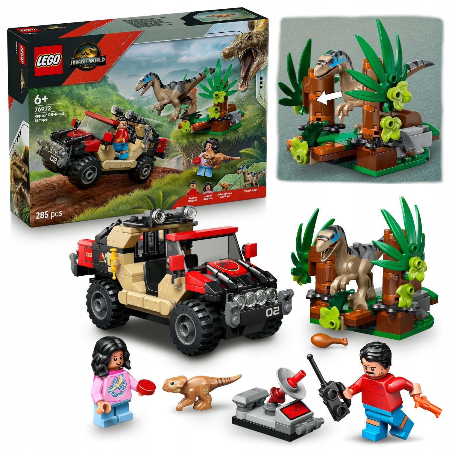 Набір включає іграшку -іграшку та пристрій для відстеження, кущ з сюрпризною функцією, за якою ви можете встановити Velociaptor - та багато іншого.