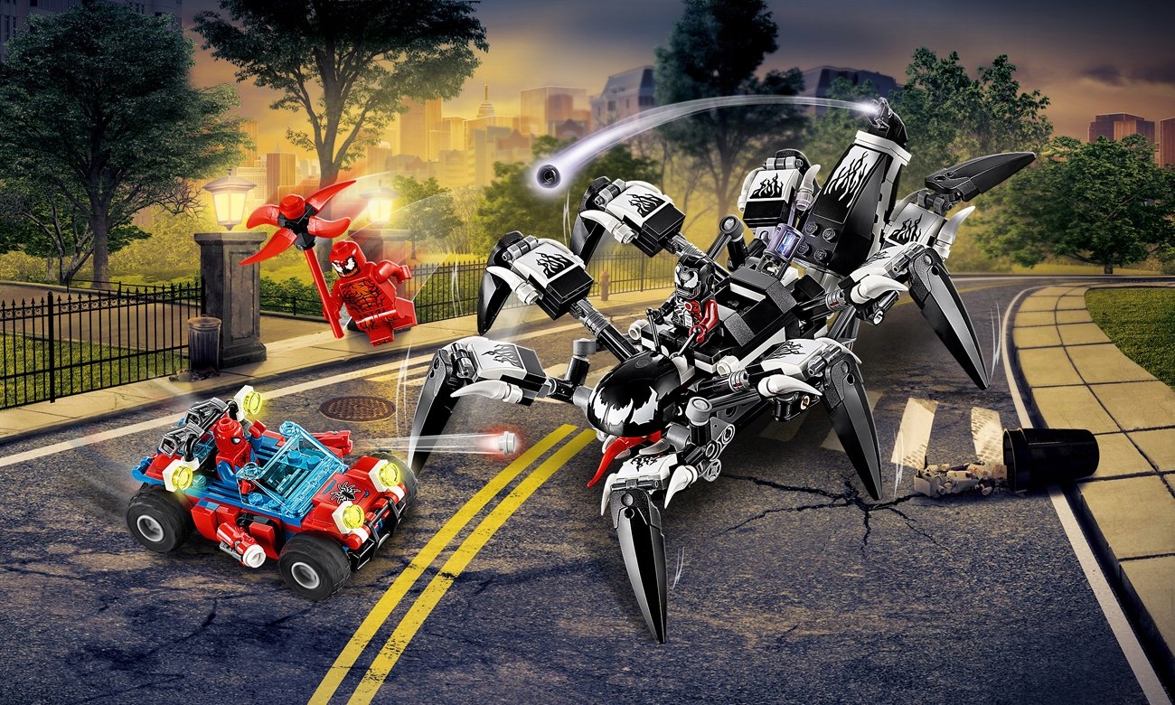 - Позуз Venom має вісім рухомих ніг і шпильку ззаду. Баггі Людини-павука має два шпильки. У набір входять три мініфігурки: Людина-павук, Карнаж і комбінація Залізної людини та Венома: Залізна отрута.