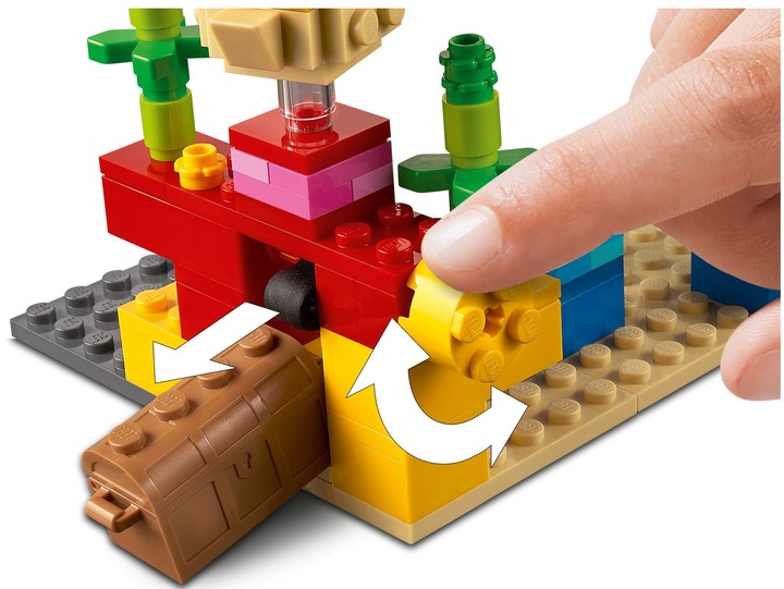 Барвистий кораловий риф сповнений автентичних деталей Minecraft™ і дивовижні аксесуари, такі як скриня зі скарбами, що відкривається, із рибою та перлиною.
