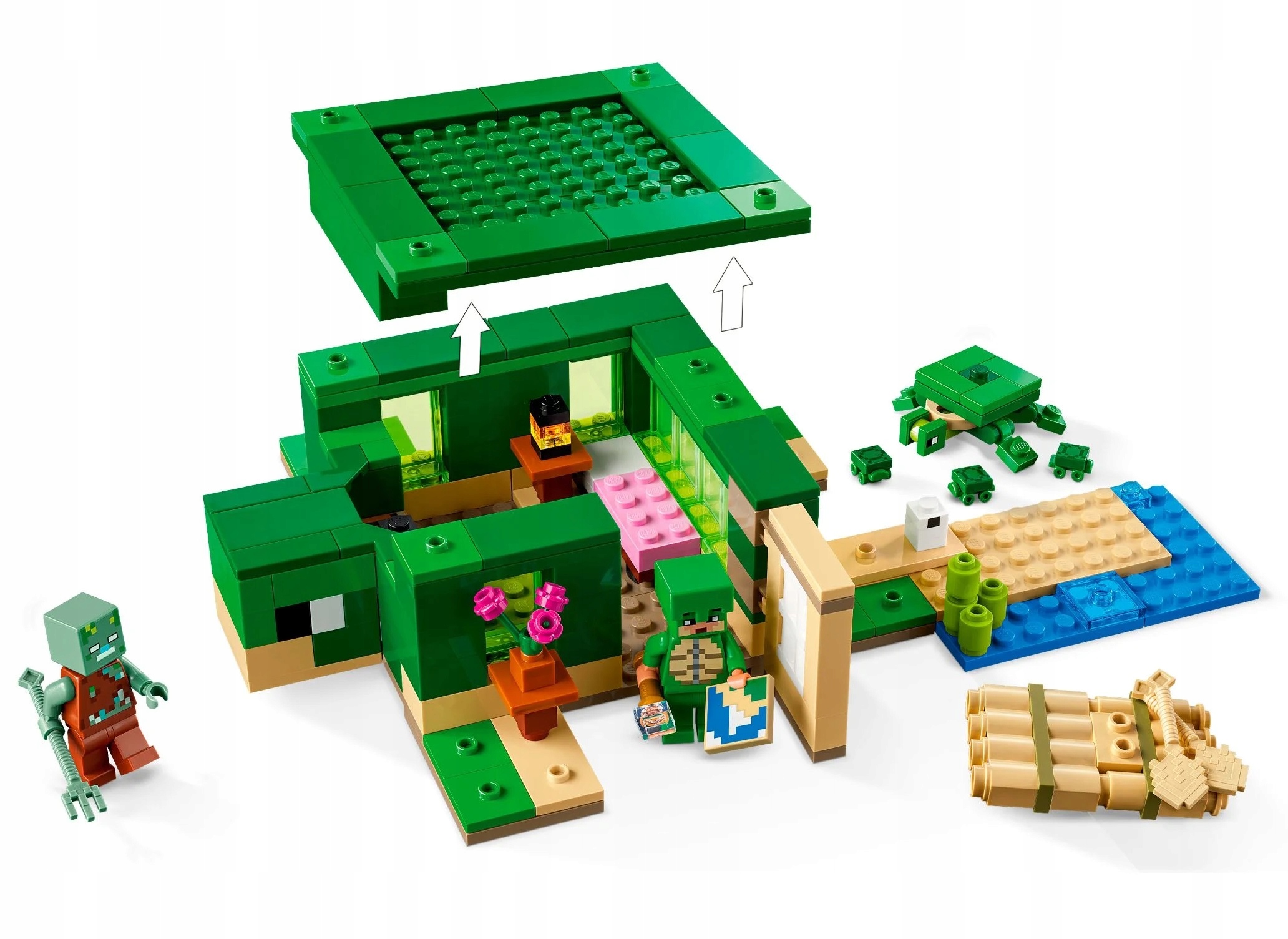 Гравці будують будинок у формі черепахи прямо з Minecraft, з вікнами, ліхтарями, дверима, ліжком, столом, верстаком і піччю. Підйомний дах забезпечує легкий доступ до салону. Зовні є пляж із цукровою тростиною, черепаховими яйцями та бамбуковим плотом з веслами. Також є знамениті фігурки і моби Minecraft: воїн в черепашачій шкурі і шоломі, утопленик з тризубом, черепаха, що харчується морською травою, і три маленьких черепахи. Серед аксесуарів також карта і телескоп. Любителі екшену, творчого будівництва та догляду за тваринами будуть у захваті від цієї універсальної іграшки. Для додаткової цифрової розваги додаток LEGO Builder дозволяє будівельникам масштабувати та обертати моделі в 3D і відстежувати їхній прогрес.