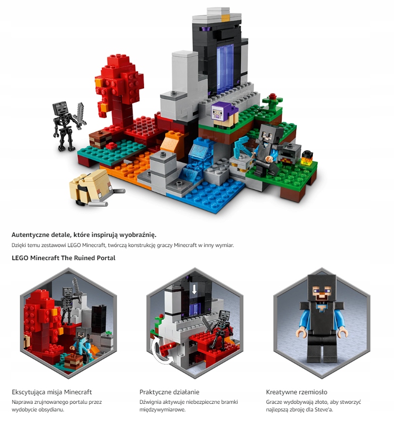 Набір LEGO® Minecraft Руйнований портал — це не лише модель для створення, це також шлях до дивовижних пригод між вимірами. Завдяки реалістичним деталям набір надихає на рольову гру та уяву.