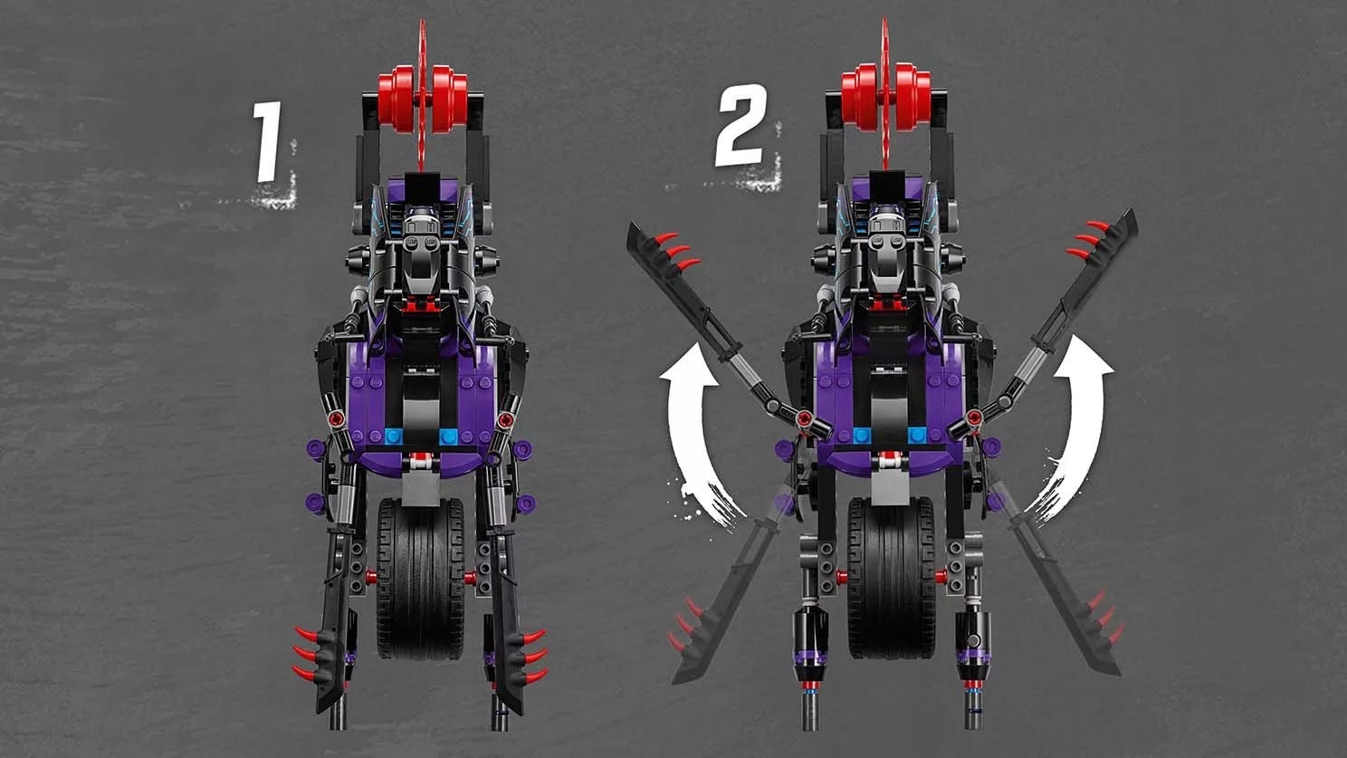 LEGO Ninjago 70642 - Кіллоу проти самурая Чоппер Oni оснащений обертовою пилкою спереду, висувними лезами та знімними скейтбордами для Killow. Рухомий механізм Samurai X має 2 стад-шутери, лезо, що обертається, і знімний самурай