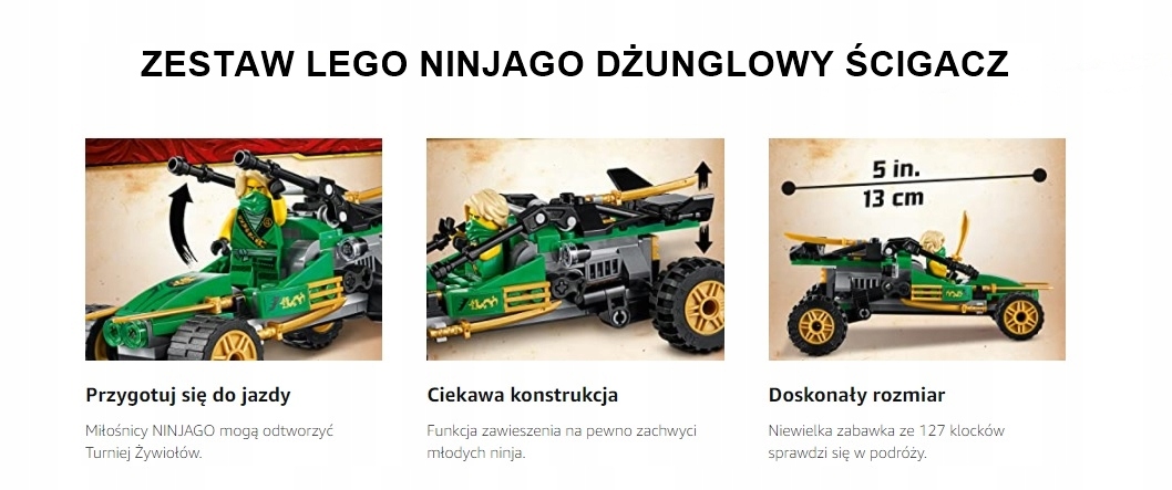 • Ця іграшка є новою версією спідера в джунглях із серії NINJAGO® Masters of Spinjitzu — вона має цікаву підвіску b> завдяки якому ровер можна утримувати натиснутим спливає. Ви можете використовувати його для перегонів або поставити на полицю в спальні як прикрасу.