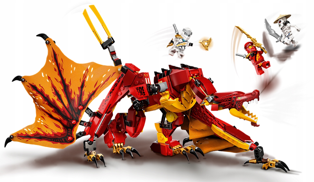 - Високо деталізована модель дракона має рухомі ноги, крила, щелепу та хвіст. На спині істоти є сідло, на якому мініфігурки ніндзя можуть сидіти перед битвою.