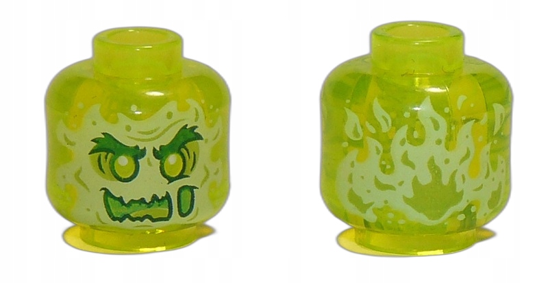 lego minifigure, head alien ghost with yellowish green face, bushy eyebrows, slime mouth and flames in back pattern - Vented Stud