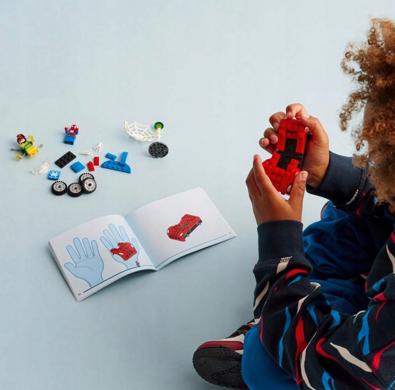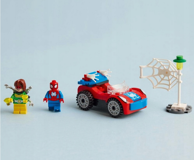 - Знакові персонажі — включають мініфігурки Людини-павука та Дока Ока, а також автомобіль із 2 мережами, що світяться в темряві, і стартовим блоком у стилі шасі для заохочення початківців будівельників