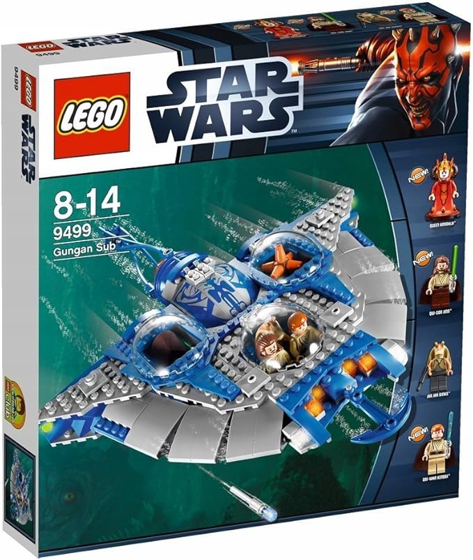- LEGO Star Wars-9499 Gunggan Sub (TM) JAR JAR BINKS разом з друзями Оби-Ван Кенобі та Кві-Гон Джинн перетинає рідке ядро планети Набу на елегантному підб. Gungan Sub моделюється на численних істотах, які населяють цей підводний світ і оснащені великою кабіною, вантажним зазором, коробками для зберігання, поворотним хвостом як приводом і міні -підводним човном з Harpune. Він містить королеву Амідала, Оби-Ван Кенобі, Кві-Гон Джин та Джар Бінкс. 4