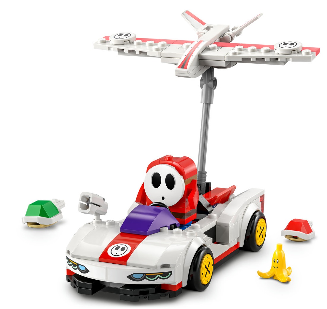 Їздіть, дрейфуйте, літайте, стріляйте гранатами тощо з цим ігровим набором для дітей LEGO® Super Mario™: Mario Kart™ (72045). Набір стане веселим подарунком на день народження для хлопчиків, дівчаток і геймерів віком від 7 років і включає фігурку Сором'язливого хлопця та копію P-Wing з цегли з функцією стрільби гранат, стандартні шини та знімний планер. Також додається банановий елемент, який ви можете кидати в картинги своїх суперників!