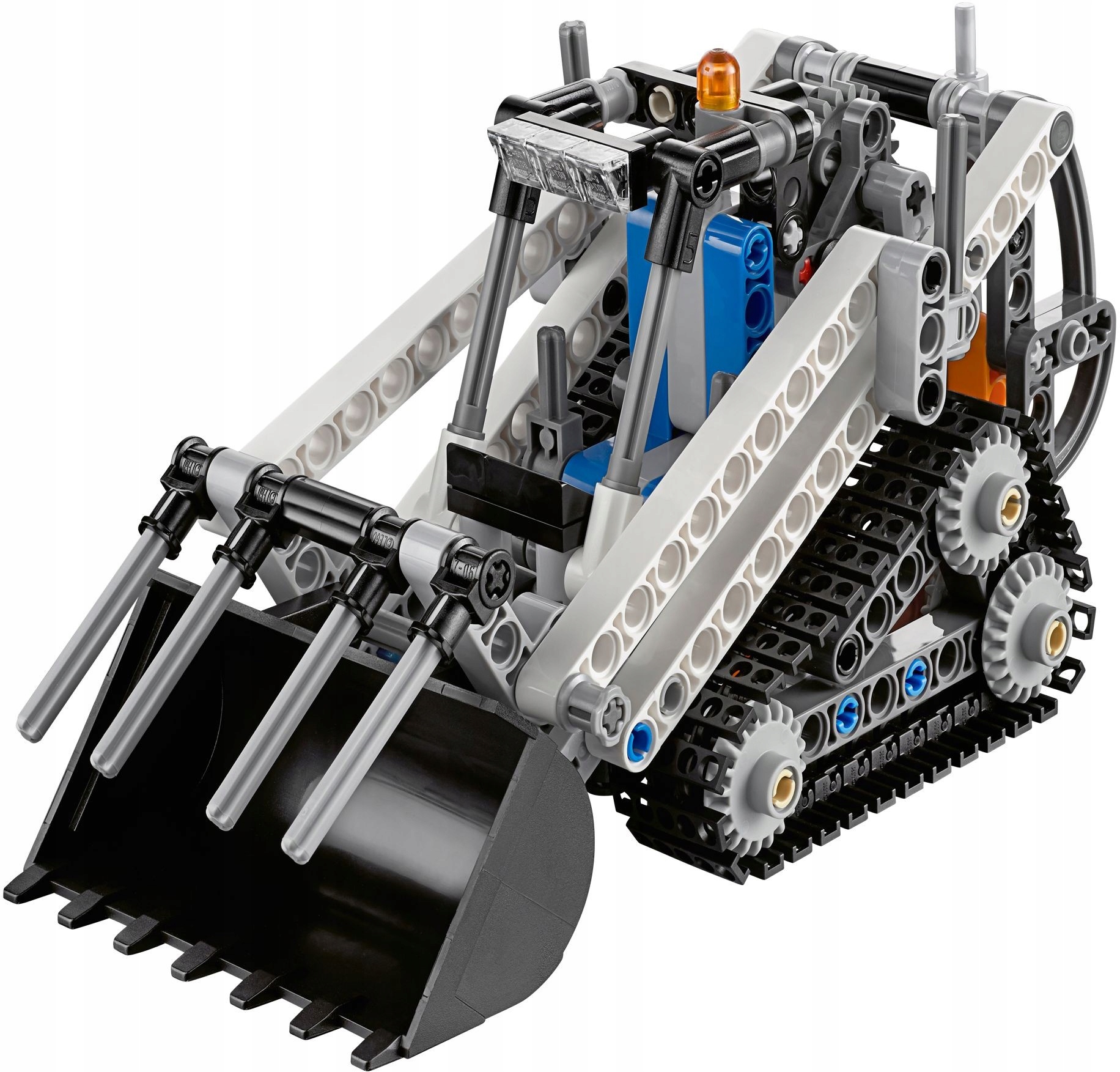 - It contains a large, tilted spoon with a working gripper, a universal boom mechanism with a rear joint, a large, triangular caterpillar system, roof headlights, a warning siren, a gear lever and a vertical exhaust pipe