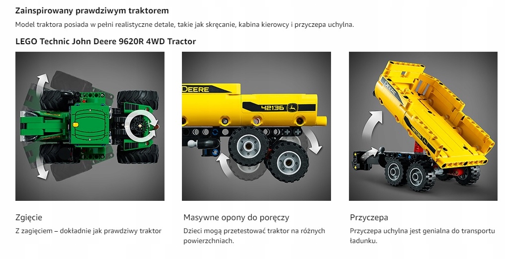 Ця вдосконалена модель із безліччю автентичних функцій і деталей — гарантія чудового задоволення та незабутніх вражень. Приєднуйтесь до світу наборів LEGO Technic та переживайте незабутні пригоди з іграшковим трактором John Deere!