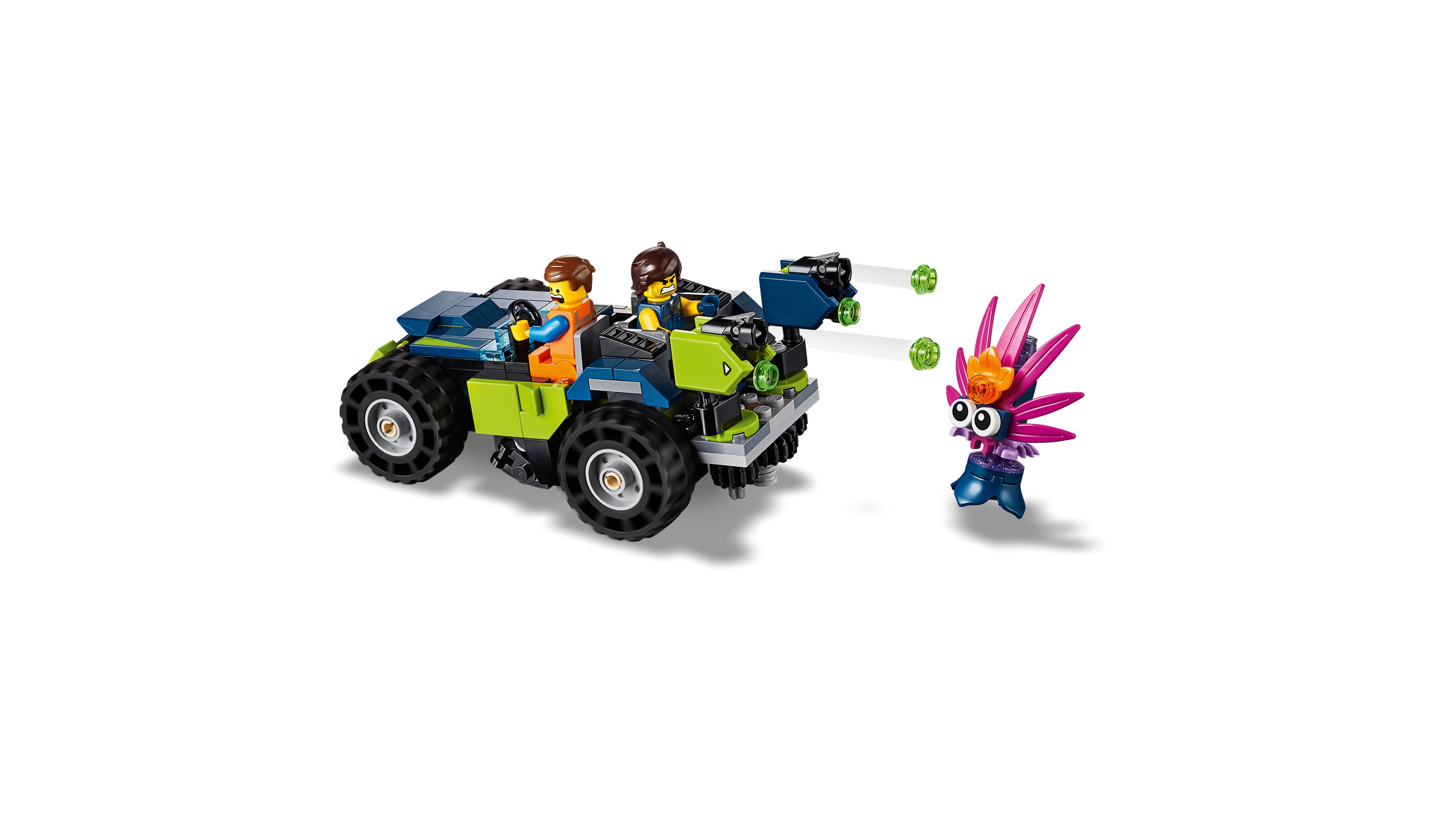 Позашляховик Rex із динозавром-розвідником на динозавровому квадроциклі чи потужному динозаврі. Позашляховик оснащений двома сидіннями для мініфігурок і обертовою вежею та двома шпильками ззаду. Динозавр має клацаючі щелепи, рухливі ноги, 2 гвоздики та знімну збірну рушницю (нефункціональну), яку також можна помістити в руку мініфігурки. Відтворіть екшн-сцени з THE LEGO MOVIE 2 за допомогою 2 мініфігурок і фігурки тварини, яку можна скласти.