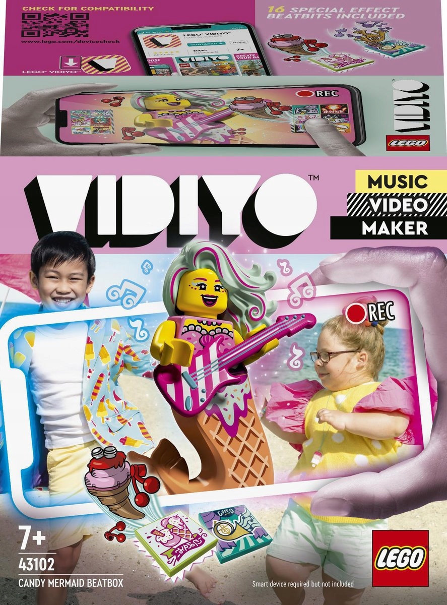 - Заохочуйте своїх дітей створювати власні музичні відео за допомогою набору LEGO VIDIYO Candy Mermaid BeatBox (43102). Містить мініфігурку русалки з гітарою, 14 випадкових BeatBits і два спеціальних BeatBits.