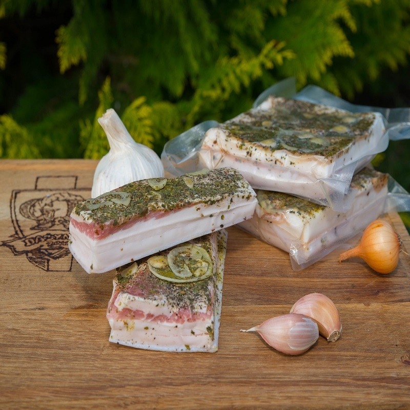 Рекомендую відмінний продукт - дозрілий бекон з перцем. Цей бекон підходить не тільки для хліба з горілкою, але і для смаження та приготування руль. Бекон спочатку дозрівав у солі, а потім, протягом наступного періоду, набув аромату та смаку чорного та зеленого перцю. Завдяки цьому бекон виходить дуже ароматним і смачним. Виготовляється без використання консервантів, 100% натуральний продукт, і за старовинним сімейним рецептом, де один раз бекон дозріває лише з сіллю, потім з лавровим листом і нарешті з перцем. Такий свинячий жир можна зберігати в холодильнику дуже довго, і найкраще його зберігати в вощеному папері або в щільній вакуумній упаковці.