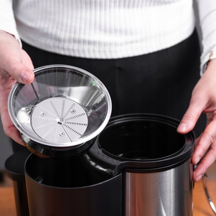➡️ Ситечко з нержавіючої сталі з тонкою структурою точно відокремлює м’якоть від соку, гарантуючи його прозорість і бархатисту консистенцію. Завдяки цьому ви отримуєте напій із натуральним смаком - без грудок і непотрібних залишків.
