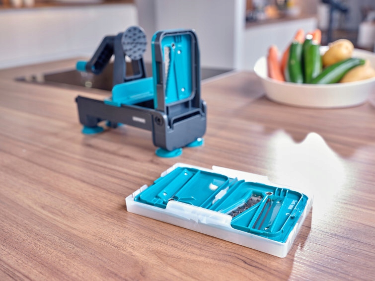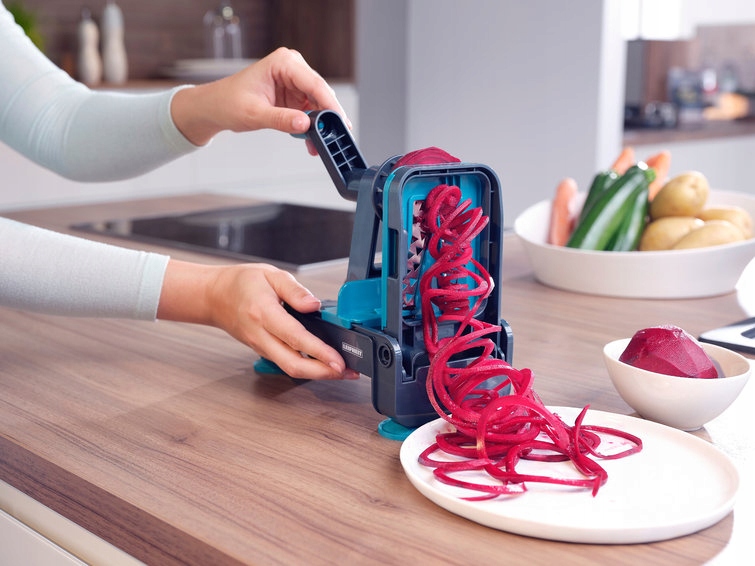 - Ця модель включає захист для пальців. Він також має нековзкі ніжки, які гарантують відмінну стабільність. Спіральний слайсер Leifheit можна мити в посудомийній машині.