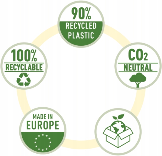 - Виготовлено з 33% перероблених матеріалів і на 100% придатне для переробки.