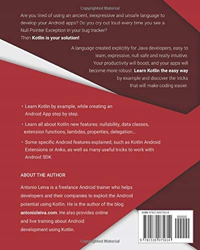 Google офіційно скасував Котлін як підтримувану мову для написання Android -додатків. Ці новини для Android для розробників Android, які тепер мають можливість використовувати сучасну та потужну мову, щоб зробити свою роботу простішою та смішнішою. Обов'язки. Якщо ви хочете бути хорошим кандидатом на нові Android Oportunities, Kotlin стає новим потребним мостовим компаніями. Тож ваш час почати дізнаватися про це! І "Kotlin для розробників Android" - найкращий інструмент. Рекомендована як Google, так і Jetbrains, ця книга буде керуватися процесом вивчення всіх нових функцій, яких Java відсутня, у легкому та веселому виграші. Ви будете створювати додаток для Android. Ідея полягає в тому, щоб вивчити мову, наприклад, надихає на наступну та типову структуру. Я зупинюсь, щоб пояснити цікаві поняття та ідеї щодо долини, порівнюючи його з Java 7. Таким чином, ви можете побачити різні відмінності, і які частини мови Вілла допоможуть вам пришвидшити свою роботу. Ця книга не має на меті посилатися, а інструмент для розробників Android, щоб вивчити Котлін і мати можливість продовжувати власні проекти самі. Я вирішу багато типових проблем, з якими ми маємо стикатися в нашому повсякденному житті, використовуючи мовний експрес та деякі інші реальні цікаві інструменти та бібліотеки. Книга дуже практична, тому вона повторюється дотримуватися прикладів та коду перед комп’ютером і спробуйте все, що йому запропоновано. Ви могли, як, якби, першим прочитати, щоб отримати широку ідею, а потім зануритися на практику.