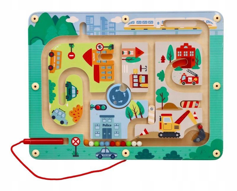 Магнітний лабіринт - це дерев'яна дошка. з красивим принтом, покрита прозорим склом з пластиком. З'єднавшись разом, вони не дозволяють кулькам висипатися. Вони вимагають від дитини зосередженості і тим самим допомагають їй заспокоїтися.Своє місце також має магнітна паличка, прикріплена до основи та з’єднана з нею шнурком.