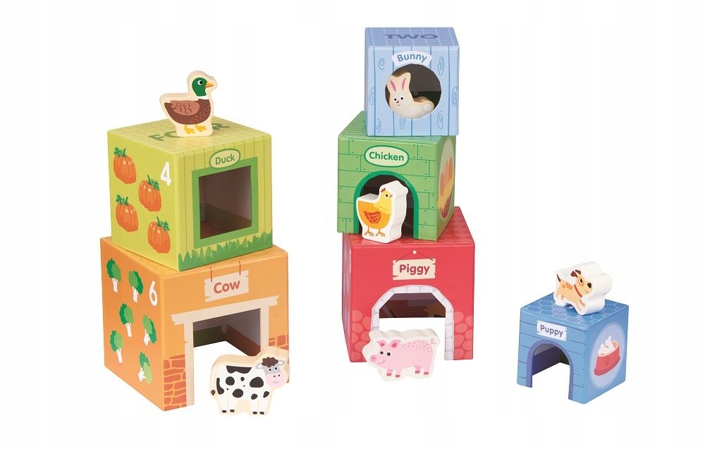 Дитина може розставити всі чашки та тварин у будь-якій конфігурації. Він може розташувати їх у вежі, він може розташувати їх незалежно, щоб створити власну ферму, де кожна фігура має свій будинок. Нарешті він може сховати чашки одна в одну, тому що кожна наступна менша за попередню. Таким чином дитина вивчає зв’язки між предметами. Це ціла купа чудових атракціонів для малюка і стане чудовою розвиваючою іграшкою.