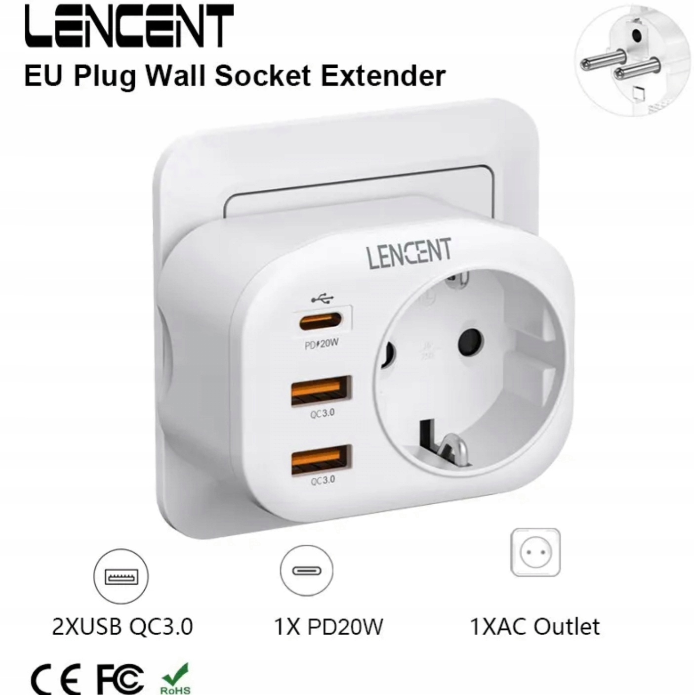 LENCENT адаптер розетка зарядний пристрій 4 в 1, 2x USB-A, 1x USB-C Pd