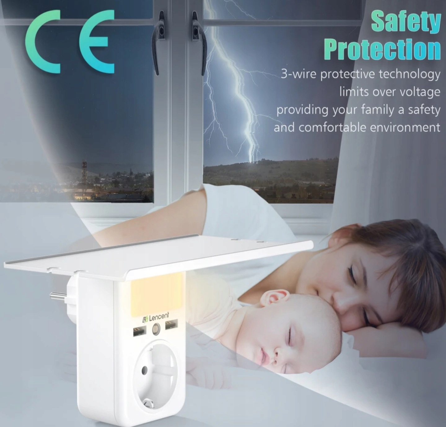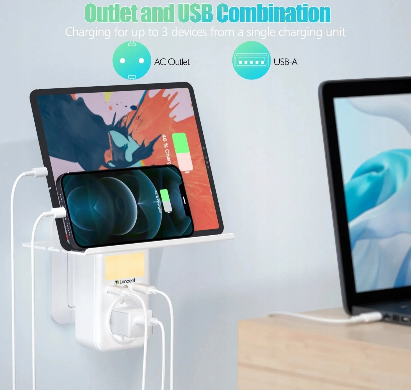 LENCENT Ładowarka 2x USB A, gniazdo 4kW, z półką/regałem, oświetlenie nocne
