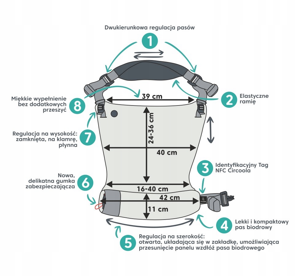 стабільного та комфортного, регульованого ременя стегна та гнучкої руки дозволяють легко і швидко відповідати дитячому носієм із різним структурою тіла