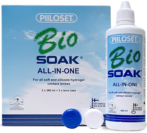 Piiloset BioSoak – це багатофункціональний розчин для догляду за лінзами, розроблений у співпраці з Організацією з питань алергії та астми у Фінляндії. p>