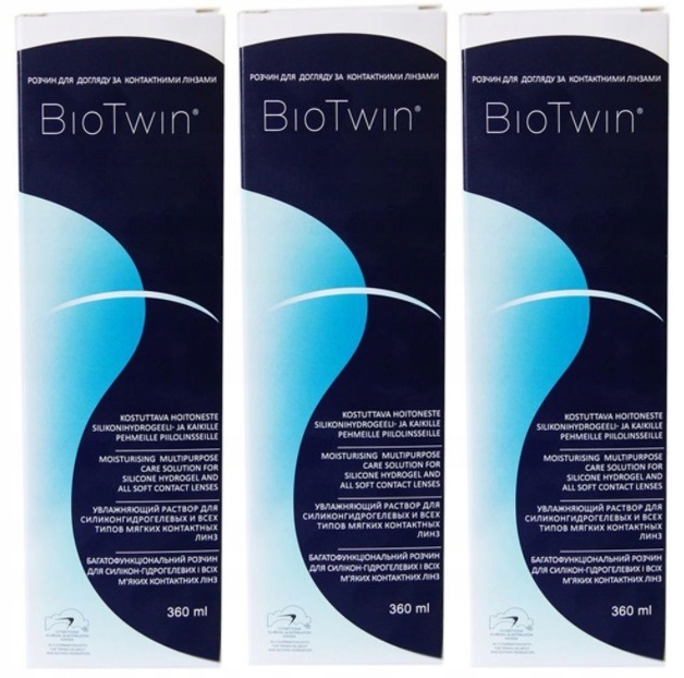 До складу рідини BioTwin входить унікальна комбінація Twin-Edaxyl з гіалуронова кислота, яка при щоденному застосуванні забезпечує зволоження лінзи, видалення білкових речовин та інших забруднень, а завдяки унікальній здатності гіалуронової кислоти утримувати воду покращує зволоження поверхні рогівки. .