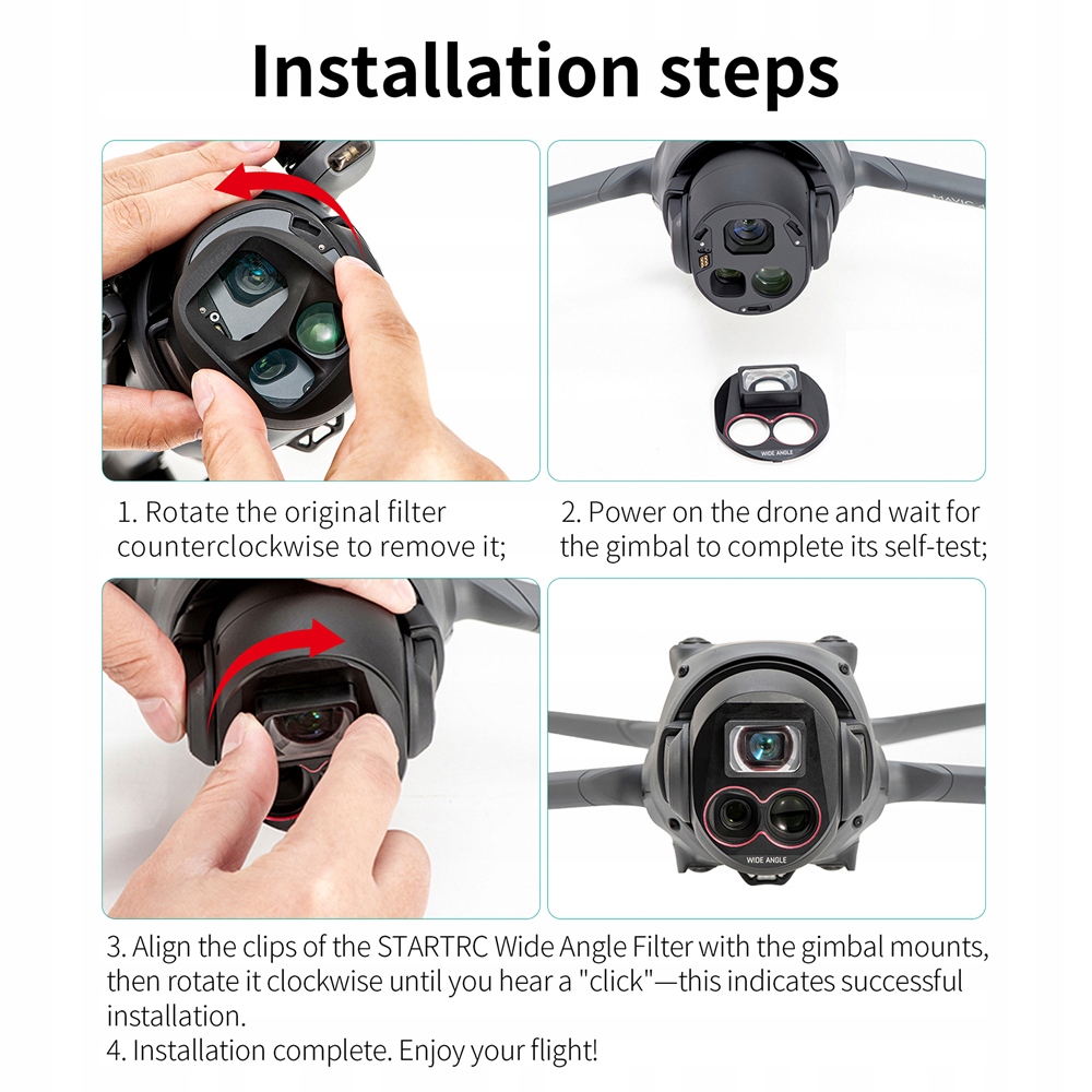 【Широка кутова об'єктив】 легко закріплюється на передній частині об'єктива Mavic 4 Pro і негайно розширює поле зору, забезпечуючи приголомшливу широку кутову фотографію. Широкі 16 ° -Нові враження. Будівництво】 Легка конструкція Mavic 4 Pro Aluminium, стабільне використання тривалий час, з матовим чорним покриттям, щоб запобігти витоку світла або з’являтися. Конструкція суспензії, швидка установка, може бути суворо прикріплена до Mavic 4 Pro і не впаде під час фотографії.