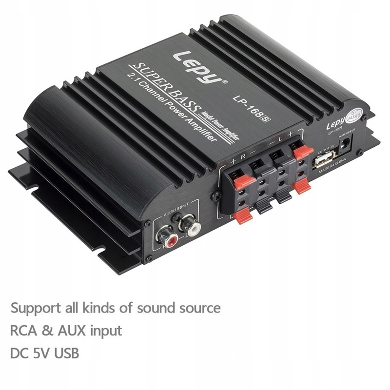 Lepy LP-168S 2,1-канальний стереосистент Super Bass Hi-Fi Audio для автомобілів, мотоциклів, будинку, аудіо обладнання, світлодіодні світильники. Професійна потужність виходу HiFi 2.1-каналу для автомобілів, мотоциклів, човнів, домашнього використання, проста у встановленні, працює з iPods, MP3-програвачами, компакт-дисками та іншими аудіопристроями. Інтелектуальне будівництво за допомогою вдосконаленої технології циркульної технології BLT. Він використовує імпортний інтегрований циркуль для зміцнення анода та ефективного теплового розсіювання із зовнішнього тіла. Забезпечує основний струм, має автоматичний захист від перегріву ланцюга та перевантаження та має хороший хрест -розмір каналу. Він характеризується низькою шумом, низькою вагою, високою продуктивністю та хорошим звуком. Високоякісні друковані композиції та високоякісні електронні компоненти роблять продукцію більш стабільними. Корпус алюмінієвого сплаву, піскоструминство та анодований. Чутлива вхідна розетка Cinch забезпечує гарну передачу для слабких сигналів. На передній частині є кнопки низьких, високих і обсяг тонів, які можна вільно відрегулювати.