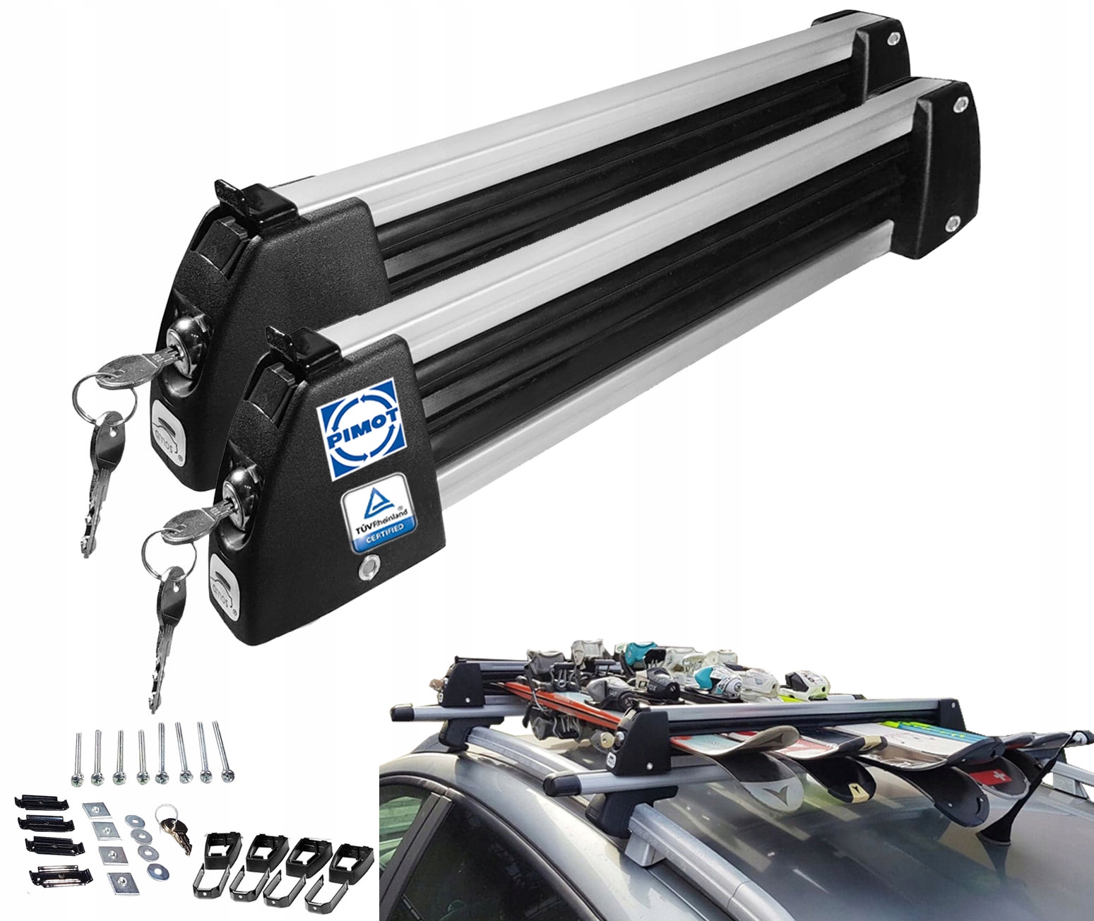 - Набір включає адаптери для підвищення висоти в футляр кріплення лижі лежать на даху