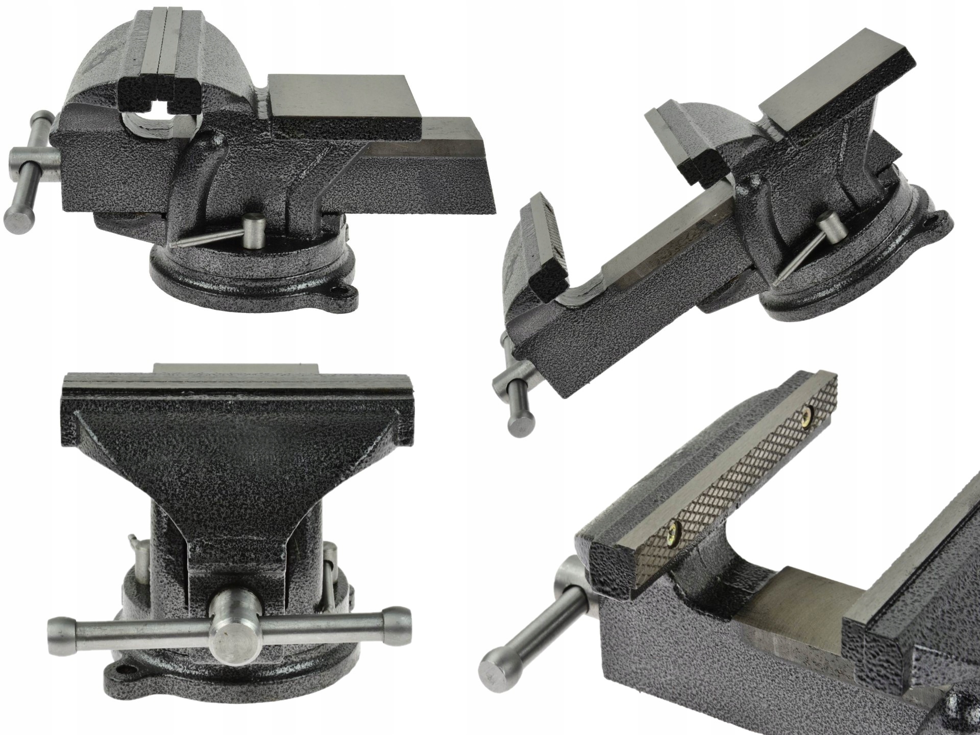 Лещата поворотні, виготовлені з високоякісних матеріалів. Сталеві лещата з протиковзкими поперечними вирізами, додатково загартовані. Міцна і міцна конструкція дозволяє надійно закріпити вибраний предмет в лещатах і гарантує тривалий термін служби.
