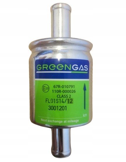 Один летючий фазовий фільтр для послідовної установки компанії Greengas 14/12 мм з паперовою вставкою. Він розміщується між інжекторами та редуктором. Для належної роботи встановлення рекомендується проходити фільтр кожні 10 000- 15 000 кілометрів або принаймні раз на рік.
