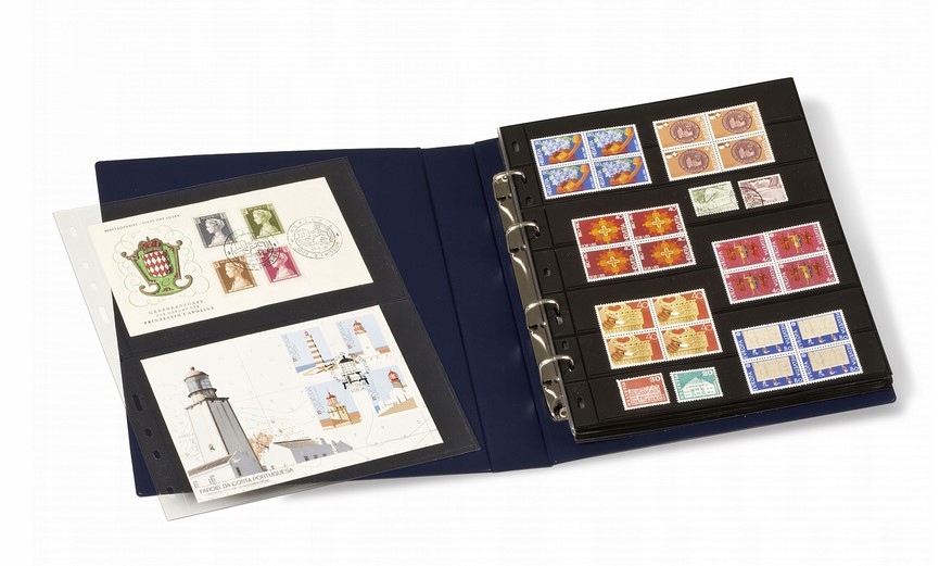 Обкладинка Optima - Easy містить чотирикільцевий механізм, який вміщує до 50 карток для марок, банкнот (залежно від їх вмісту). ) або близько 12 для монет.