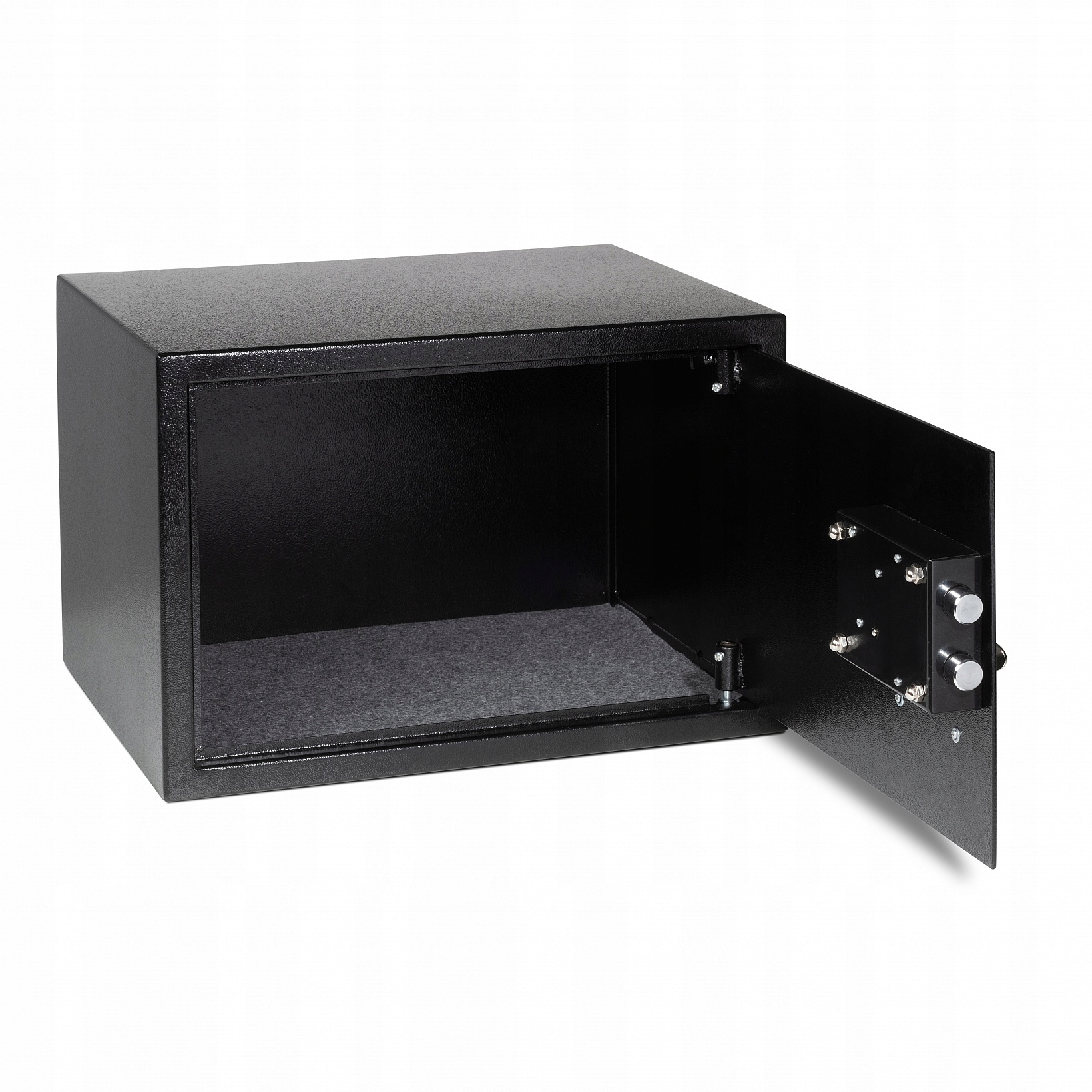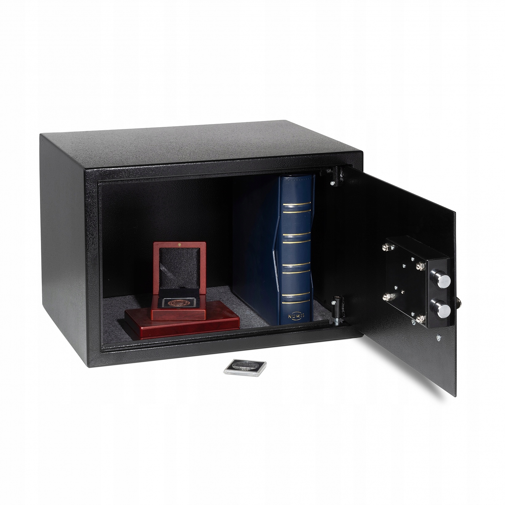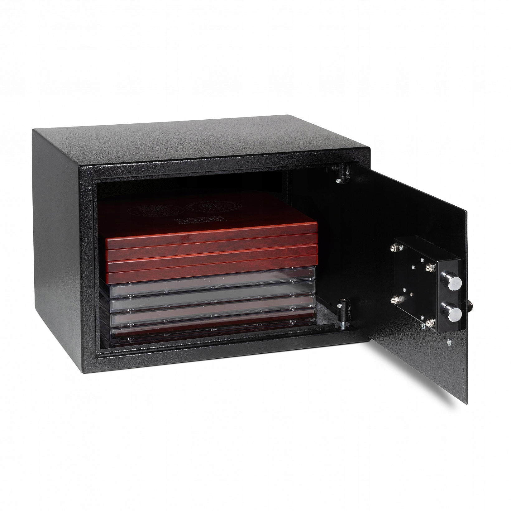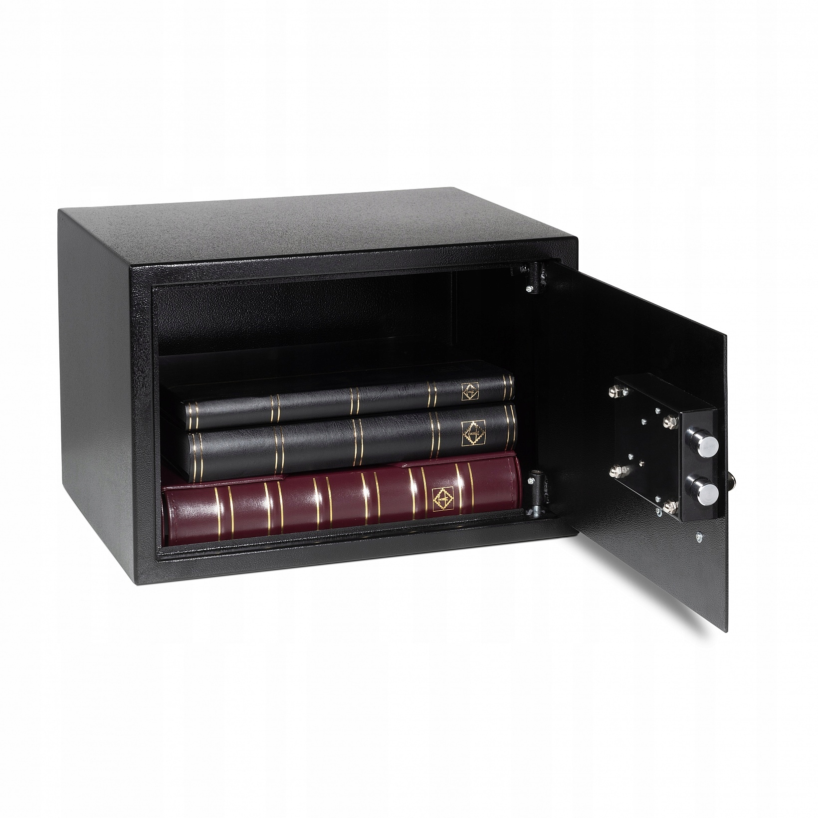 Корпус виготовлений зі сталі товщиною 2 мм, а дверцята виготовлені зі сталі товщиною 4 мм. закривається двобітним ключем і системою 2 суцільних сталевих болтів.Завдяки спеціально адаптованим внутрішнім розмірам сейф пропонує місце для, наприклад, офісної папки формату А4, 3 кільцевих альбомів Grande у футлярі, швидкозшивачів, альбому Perfect на гвинтах, Luxus затискний альбом та багато інших. М’який повстяний килимок у нижній частині внутрішньої частини захищає ваші скарби від подряпин та інших пошкоджень. Як на задній стінці, так і в нижній частині є два отвори для кріпильних гвинтів. Вони дозволяють кріпити настінний сейф. з 2 ключами з індивідуальним номером, які відповідають лише одному конкретному замку.
