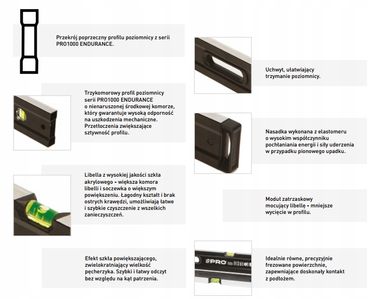 - Усі ватерпаси серії PRO1000 ENDURANCE оснащені двома рівнями, що дозволяє визначати лінію відвису незалежно від того, як ви тримаєте рівень.