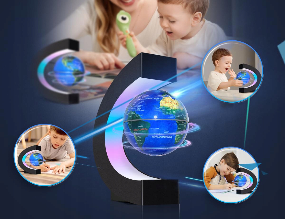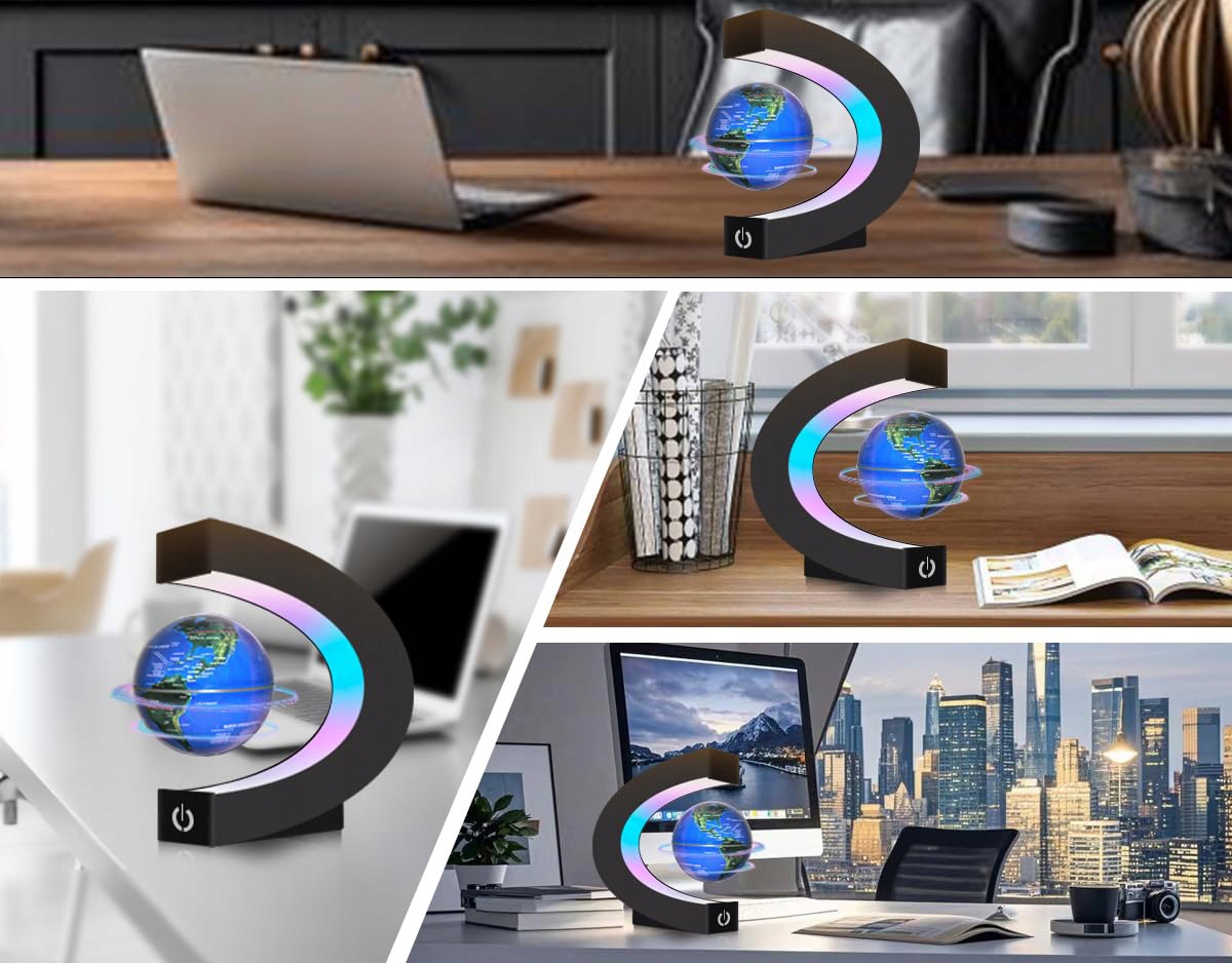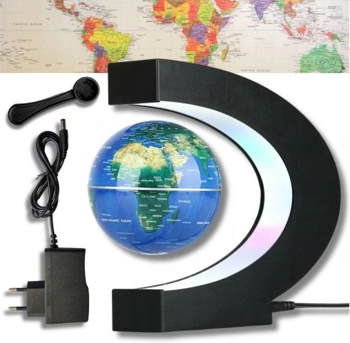 Магніт на плаваючому світовому глобусі глобус містить електромагніт і датчик магнітного поля, а основа містить мікропроцесор та електронний блок управління для сферичного ґрунту. Він може обертати 360 ° по горизонталі, акуратно штовхаючи земну кулю. Приємна прикраса на столі або полиці з книгами.