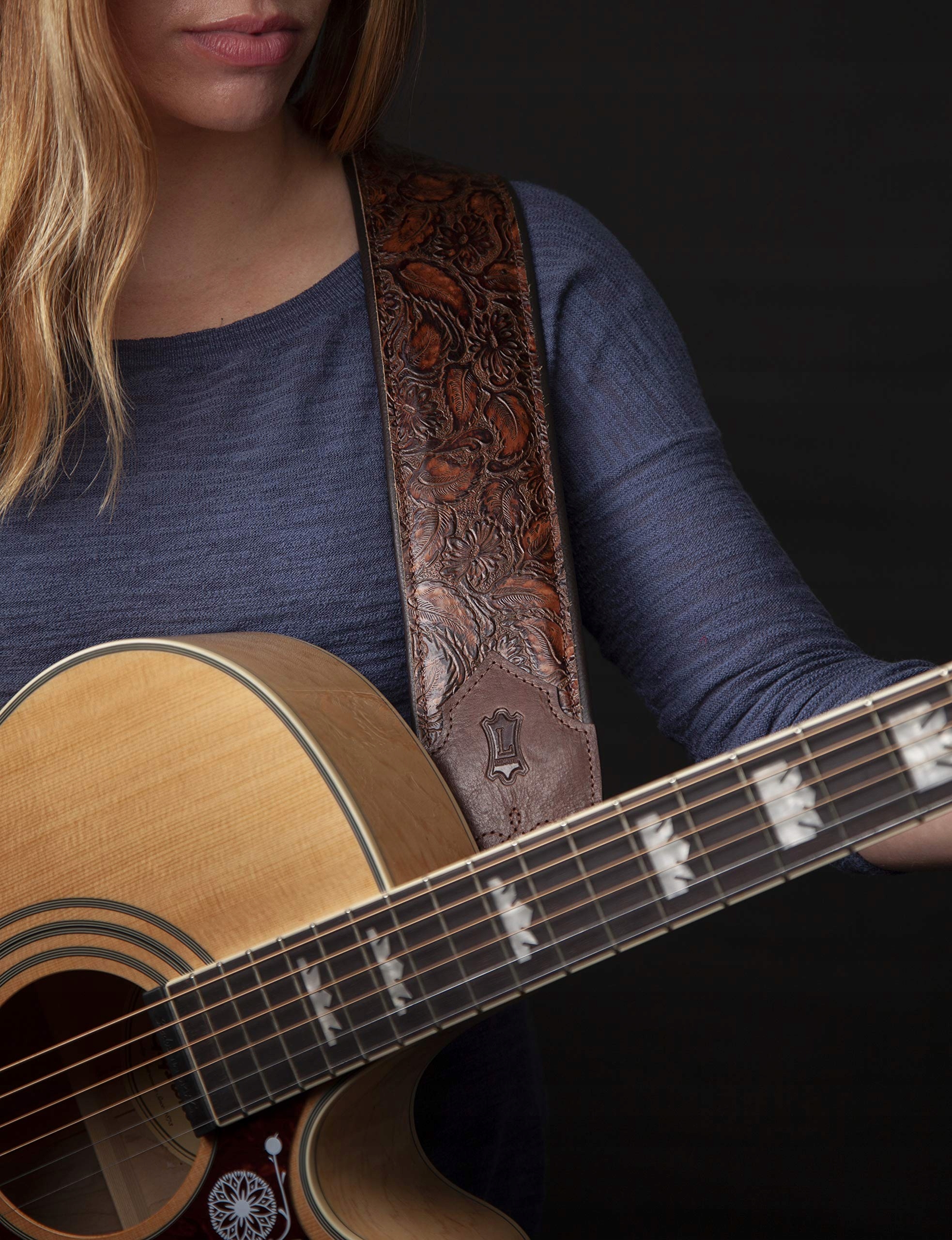 - точка кулі: шкіряний ремінець для гітари з тисненням шириною 7,5 см від Levy, регулюється до 142 см, двошаровий рельєфний гітарний ремінь з еластичною підкладкою та шкіряною підкладкою для одягу. Має західні складки з вишитими деталями, ручна робота в Новій Шотландії, Канада
