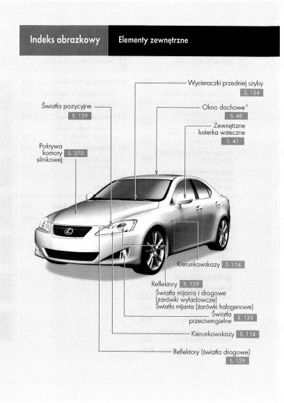 Посібник з експлуатації Lexus містить усі версії обладнання та корисну інформацію про те, як ефективно та безпечно використовувати автомобіль, напр. - покажчики, світлові індикатори, відкриття та закриття - освітлення та видимість, сидіння, відсіки для речей, опалення, вентиляція, кондиціонування - водіння, поради з експлуатації, технічне обслуговування автомобіля - рівень рідини, перевірка та доливання, екстрені операції, заміна коліс, запобіжників, заміна лампочок - технічні дані... та багато іншого, що дає мандрівникам відчуття безпеки та комфорту. Польське законодавство зобов’язує продавця додавати до автомобіля інструкцію з експлуатації польською мовою. Посібник з експлуатації автомобіля новий і польською мовою.