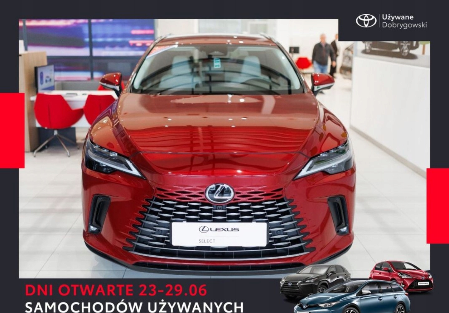 Toyota Dobrygowski - уповноважений дилер Toyota та Lexus, компанія, що працює на автомобільному ринку понад 25 років, насолоджуючись великим визнанням клієнтів, які відвідують наші салони (багато разів присуджуються як дилер року), розташованих у кількох великих польських містах.