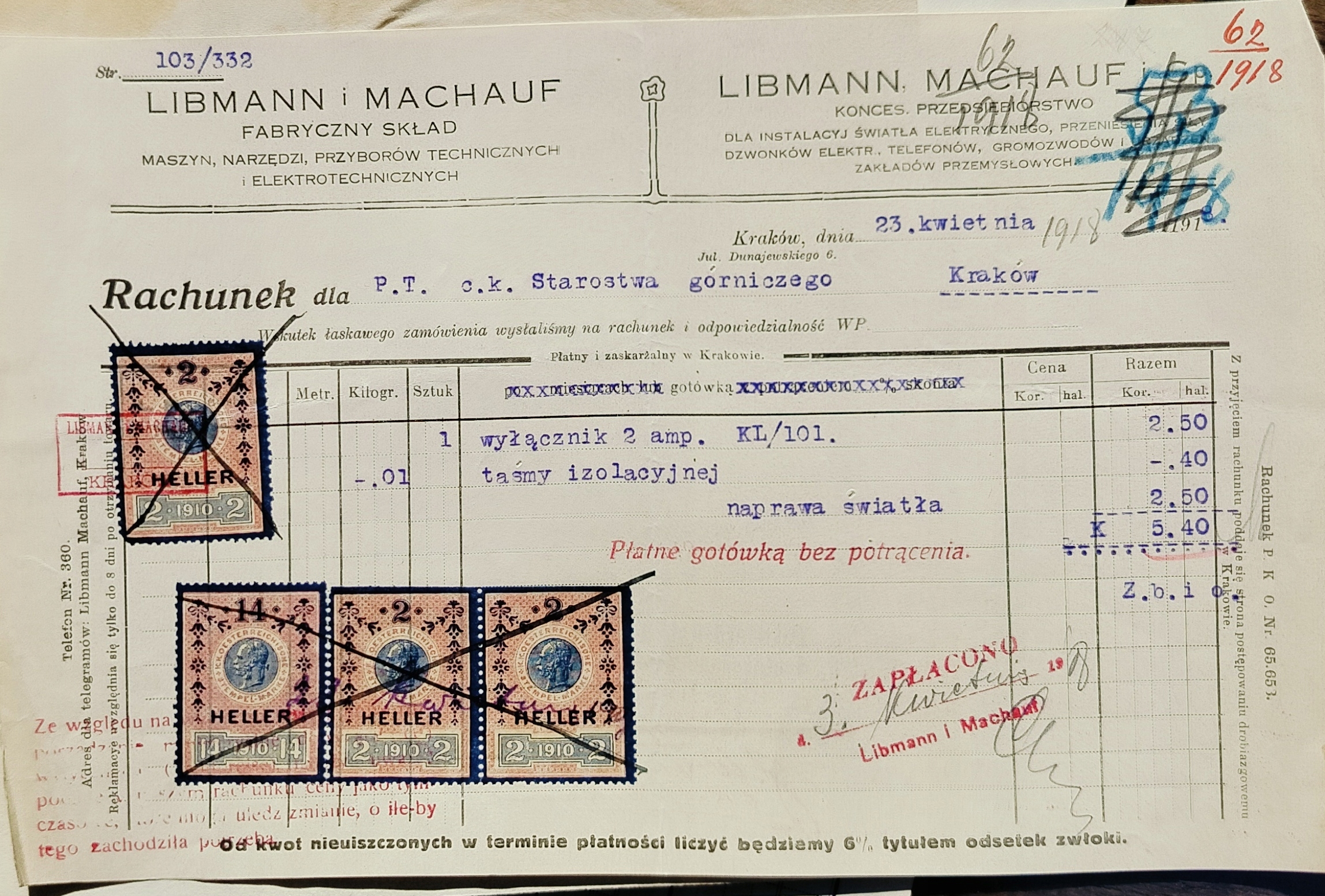Рахунок на бланку компанії - LIBMANN і MACHAUF Fabryczny Skład Maszyn, Інструменти, технічні та електротехнічні приналежності, Краків, ul. Dunajewskiego 6. Дата: Краків 23 квітня 1918 р. Придбано: вимикач на 2 ампера та 0,01 кг ізоляційної стрічки за 5 крон 40 гелерів. Формат 23х15 см, гарний стан [ЮДАЇКА] [КРАКІВ] [АФІША]1910D
