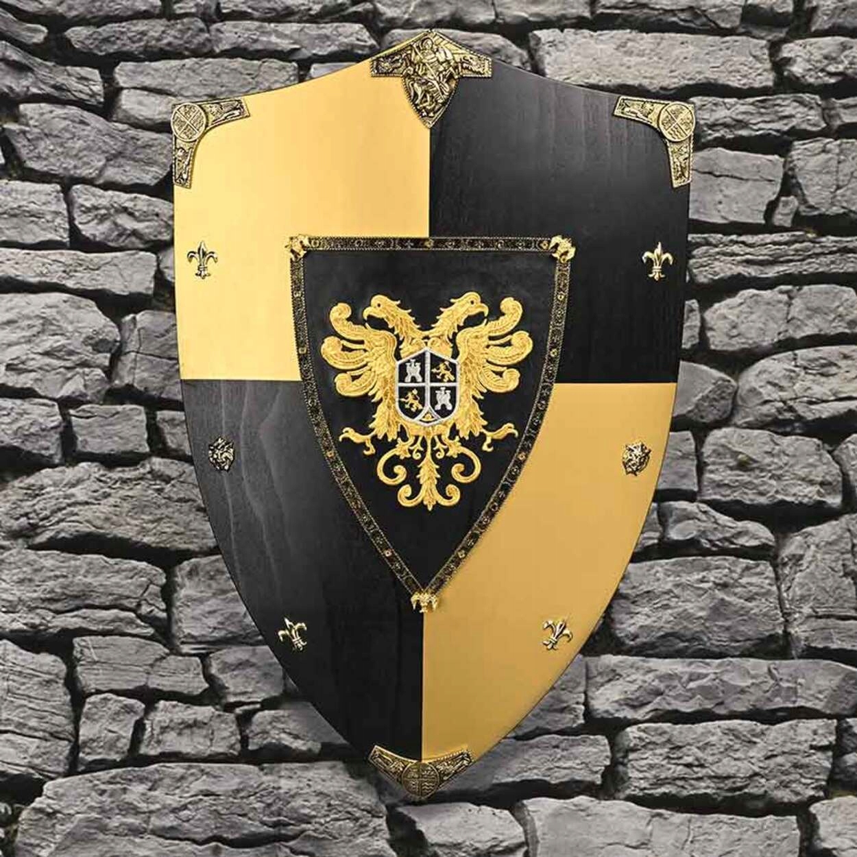 Щит, прикрашений геральдичним зображенням чорного двоголового орла.