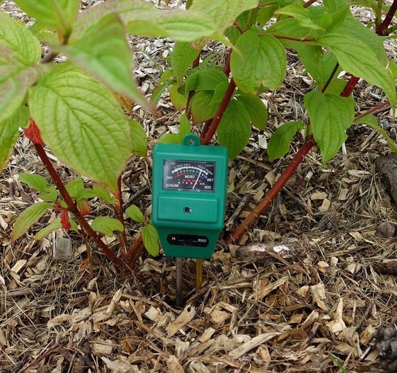 - Вставте обидва зонди в ущільнений і вологий ґрунт і приблизно через хвилину прочитайте показання pH на нижній шкалі.
