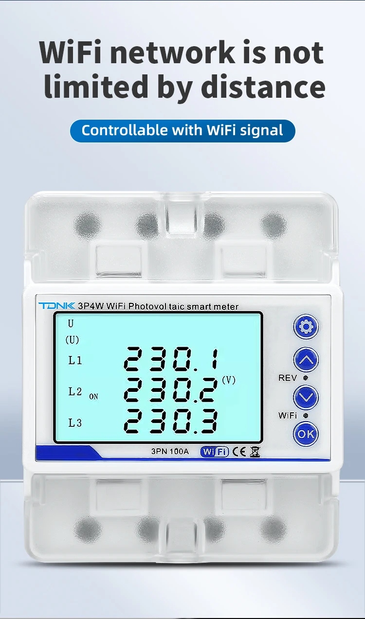 Розумний 3-фазний лічильник електроенергії з максимальним струмом 100A та напругою 380V. Він забезпечує двонаправлене вимірювання енергії (імпорт/експорт), моніторинг споживання в реальному часі через додаток Tuya/Smart Life, а також автоматичний захист від перенапруги та перевантаження. Підтримка Wi-Fi, DIN-рейка, можливість дистанційного відключення живлення та встановлення обмежень напруги, потужності та струму.