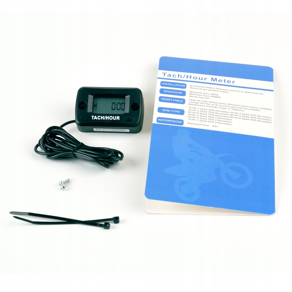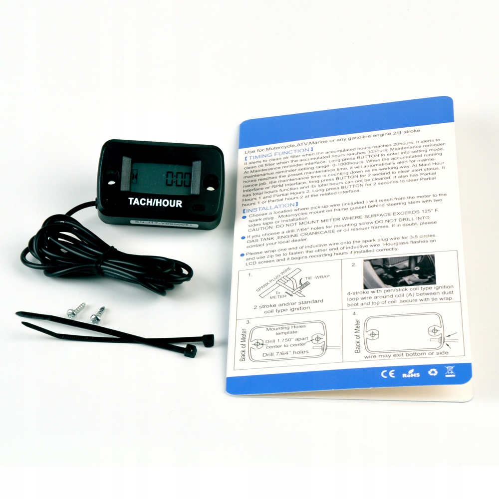 Універсальний лічильник годин роботи для дво- та чотиритактних бензинових двигунів. Просто оберніть дріт лічильника навколо дроту, що веде до свічки, щоб він не торкався землі. Потім прилад автоматично вимірює час роботи двигуна. Він також вимірює обороти двигуна. Стирається за допомогою функції читання пам'яті на максимальній швидкості.