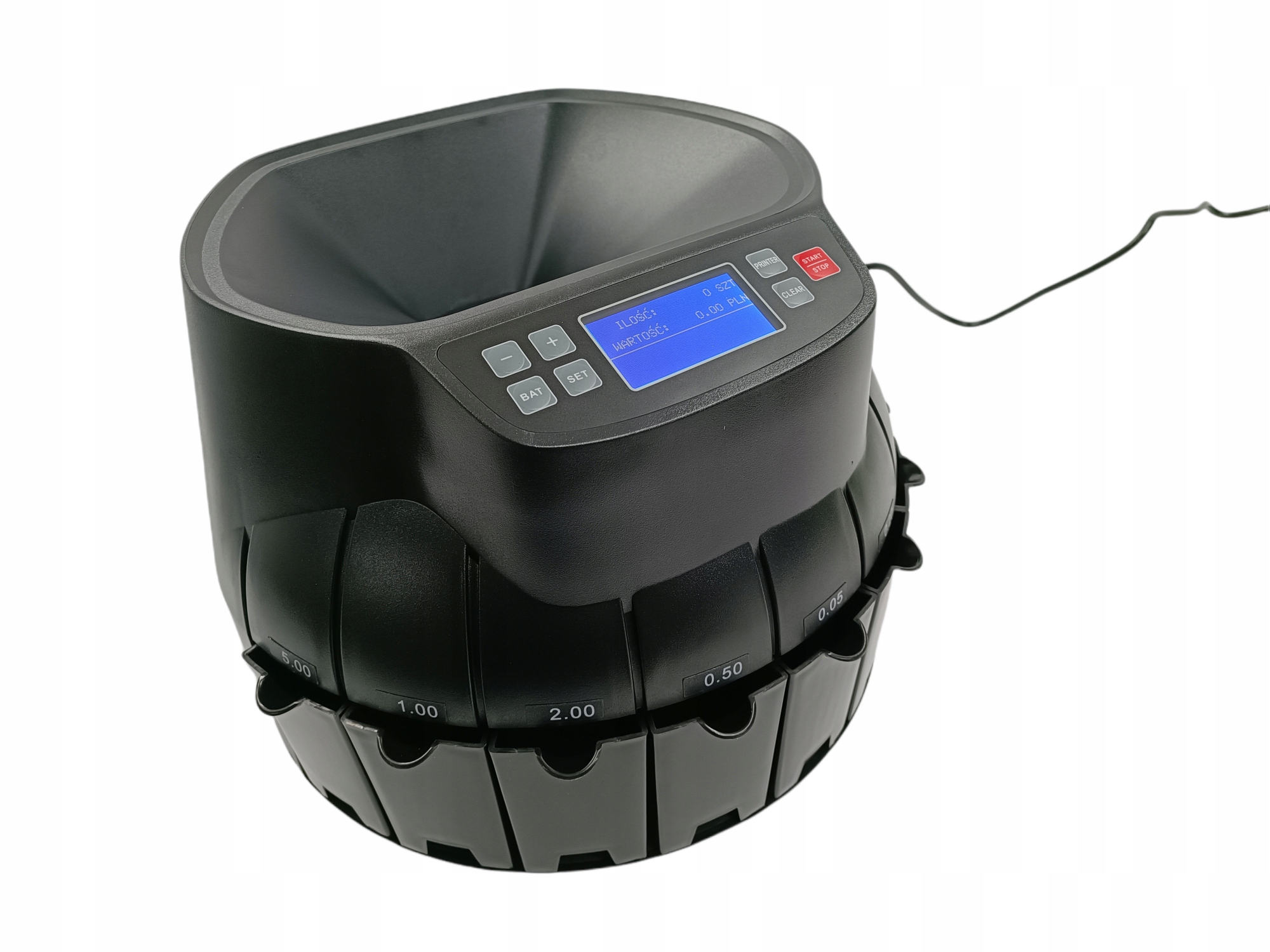 Він доступний у версії, яка сортує та підраховує 8 номіналів (без 1 гроша / 1 грош потраплятиме в контейнер з 10 грошами).
