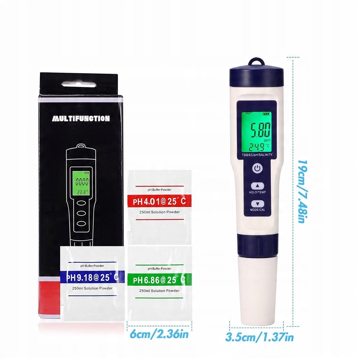 【багатофункціональний рН -метр】 Інтелектуальний pH 5 на 1 метр із зеленою підсвічуванням РК. Автоматична компенсація температури в діапазоні 0-60 ° C запобігає вимірювання неточностей, спричинених змінами температури рідини. Комплексне вимірювання якості води для забезпечення здорової води. 4 Легкий і зручний для відстеження рівня солі, у відсотках або проміле. Ідеально підходить для акваріумів, басейнів з морською водою, спа -центром з морською водою або там, де важлива солоність.