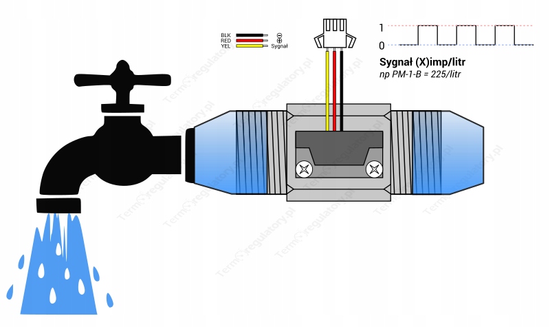 Коли вода протікає через корпус вимірювача, переміщує вал ротора - датчик генерує відповідний імпульсний сигнал X (вказаний у технічних даних). Кількість імпульсів пропорційна швидкості потоку води. Імпульси завдяки лічильником можна перетворити на зручні значення для користувача, наприклад Міллітри, літри, літри/хв.
