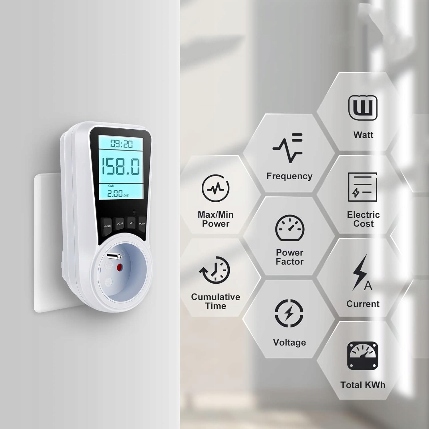 ЛІЧИЛЬНИК ПОТУЖНОСТІ НА РОЗЕТКУ З 7 РЕЖИМАМИ МОНІТОРИНГУ, LCD ДИСПЛЕЙ