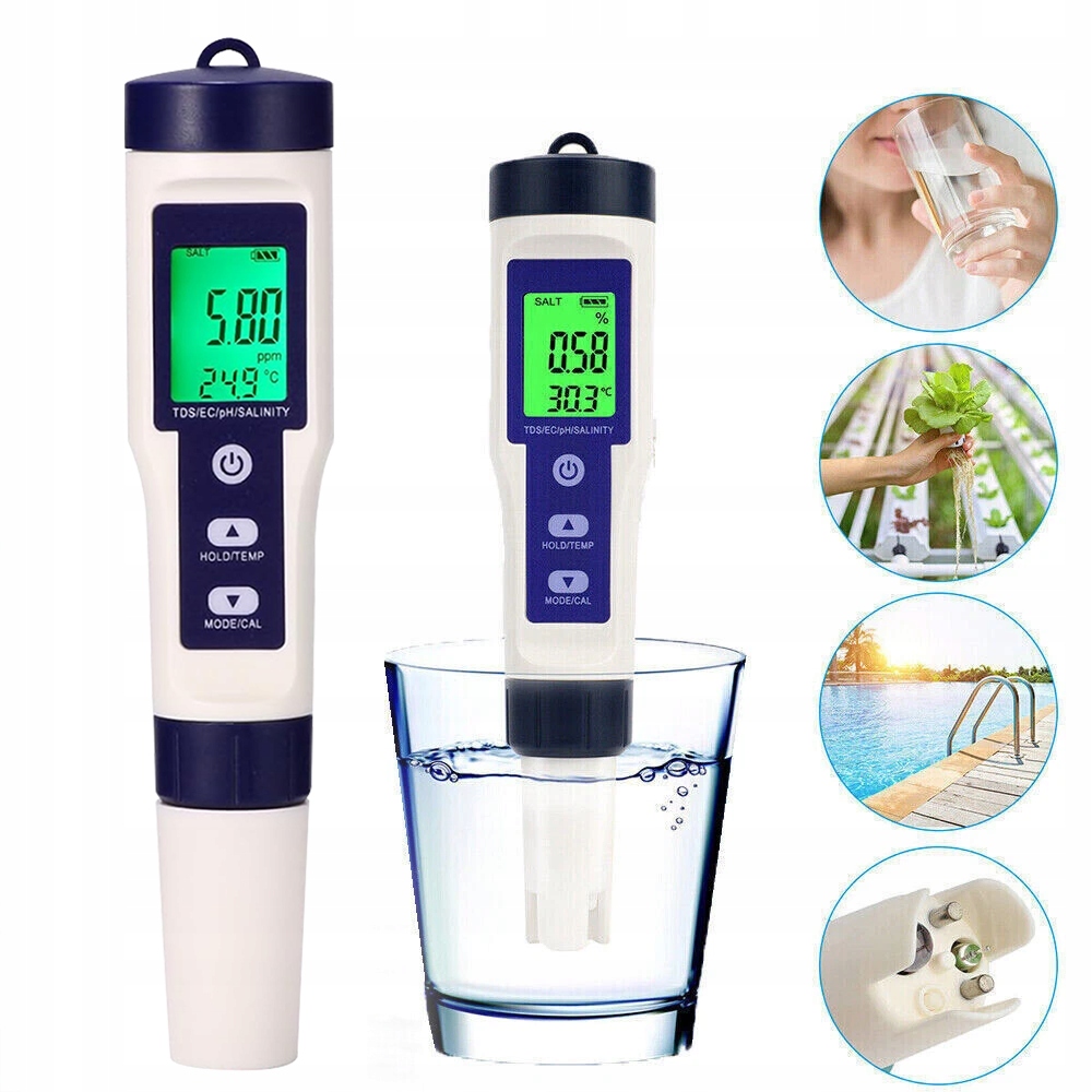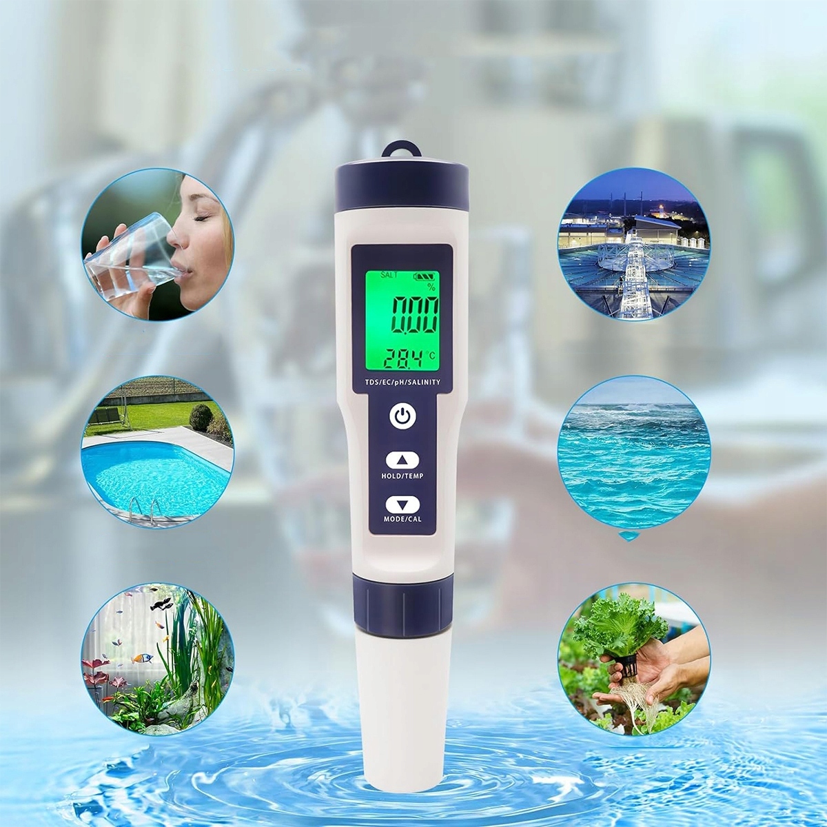 【багатофункціональний рН -метр】 Інтелектуальний pH 5 на 1 метр із зеленою підсвічуванням РК. Автоматична компенсація температури в діапазоні 0-60 ° C запобігає вимірювання неточностей, спричинених змінами температури рідини. Комплексне вимірювання якості води для забезпечення здорової води. 4 Легкий і зручний для відстеження рівня солі, у відсотках або проміле. Ідеально підходить для акваріумів, басейнів з морською водою, спа -центром з морською водою або там, де важлива солоність.
